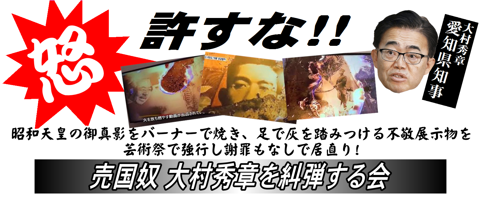 8月下旬に愛知県入りして、この愛国者総決起集会まで愛知県で昭和天皇の御真影をバーナーで焼き、足で踏みつけた行為を言論の自由だなどと居直る大村愛知県知事に対する糾弾行動を愛知県内全域で行ないます。