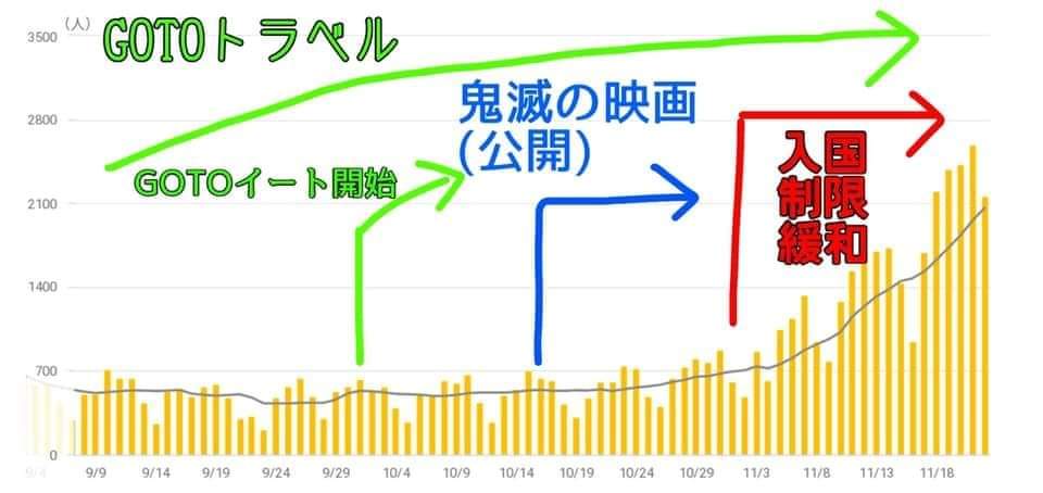 「指定11ヶ国の入国時PCR検査不要」「指定11ヶ国は出国時も検査不要」「気温の低下」「Gotoイート」「複数人での飲食」など、複数の要因があると思います。